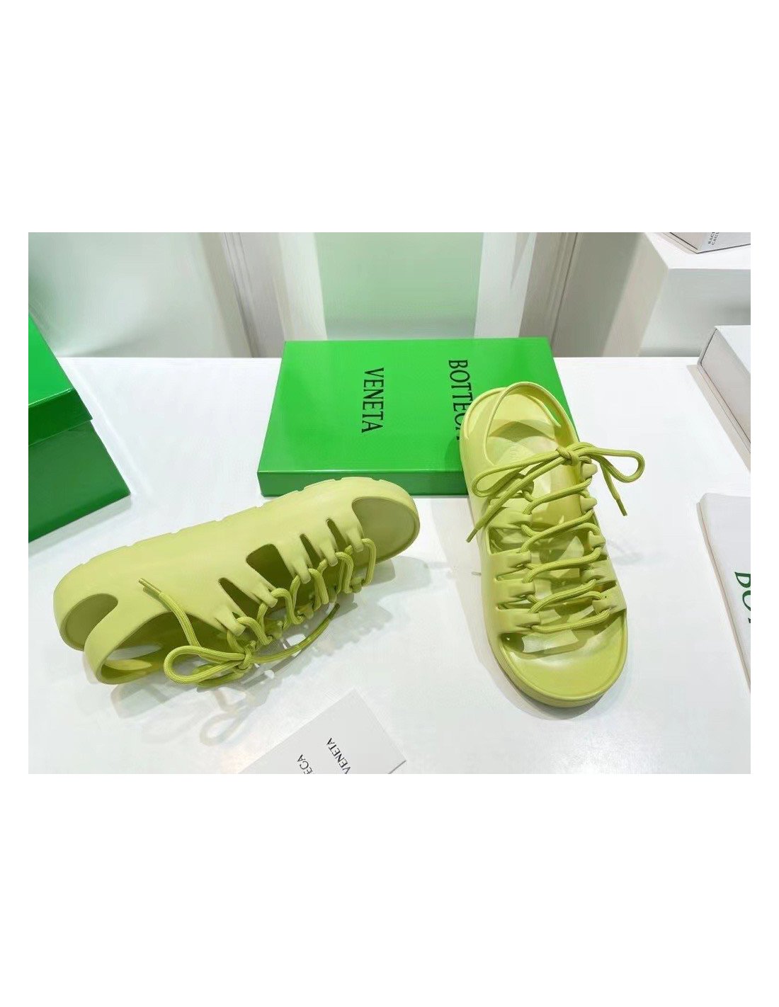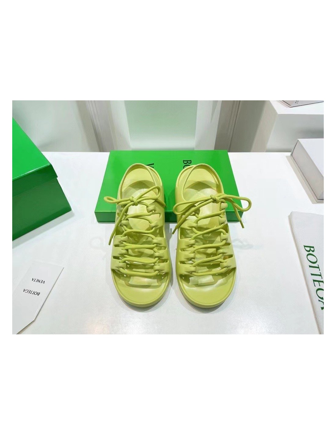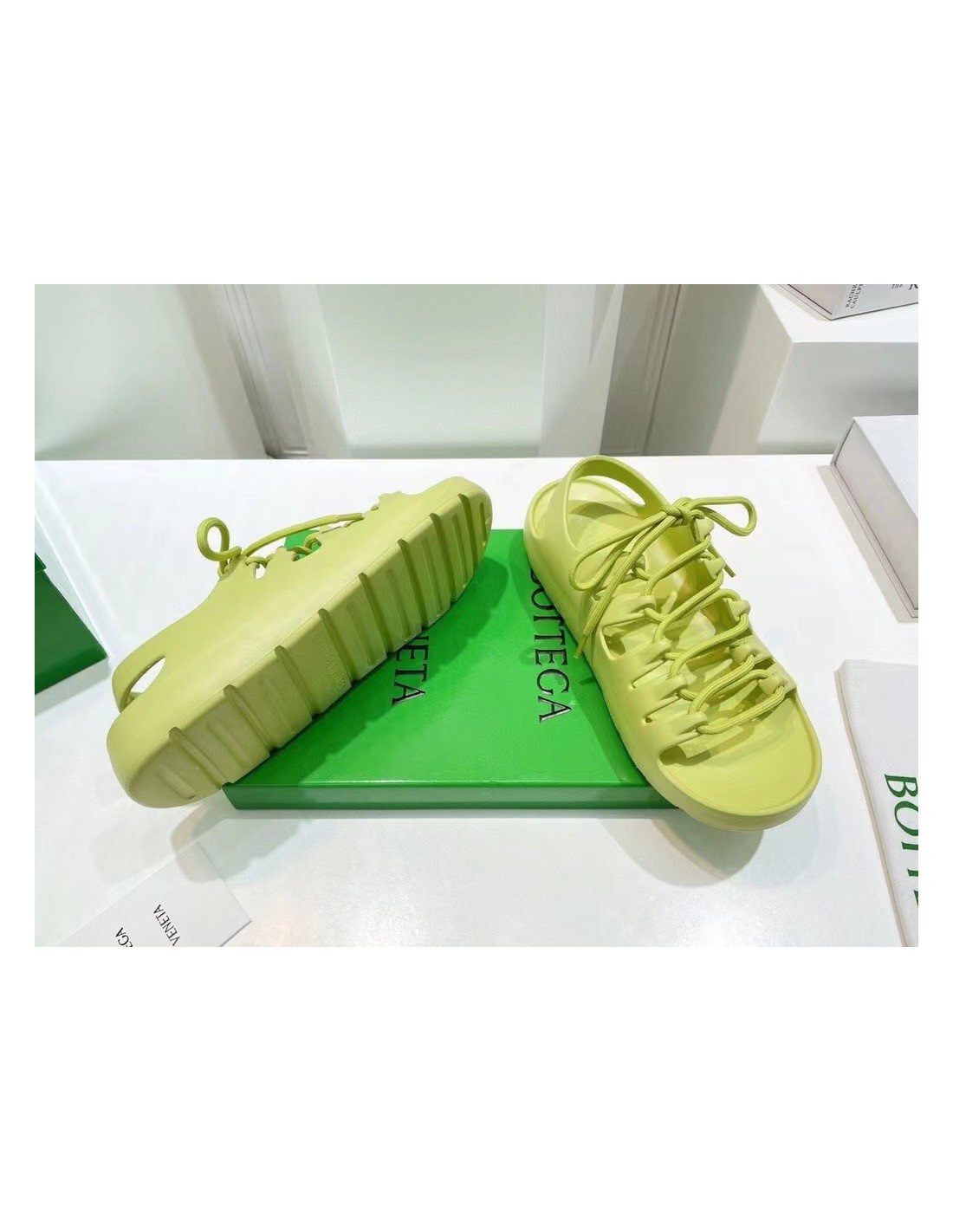 Although a clear departure from the labels signature formula and aesthetic, the Jelly sandals are still undoubtedly a creation of Bottega Veneta. Crafted from durable rubber in a seamless construction, the pair sits atop a flatform sole and is detailed with laces to the upper that intertwine between the cut-out panels ¨C a nod to the labels iconic Intrecciato weave.
