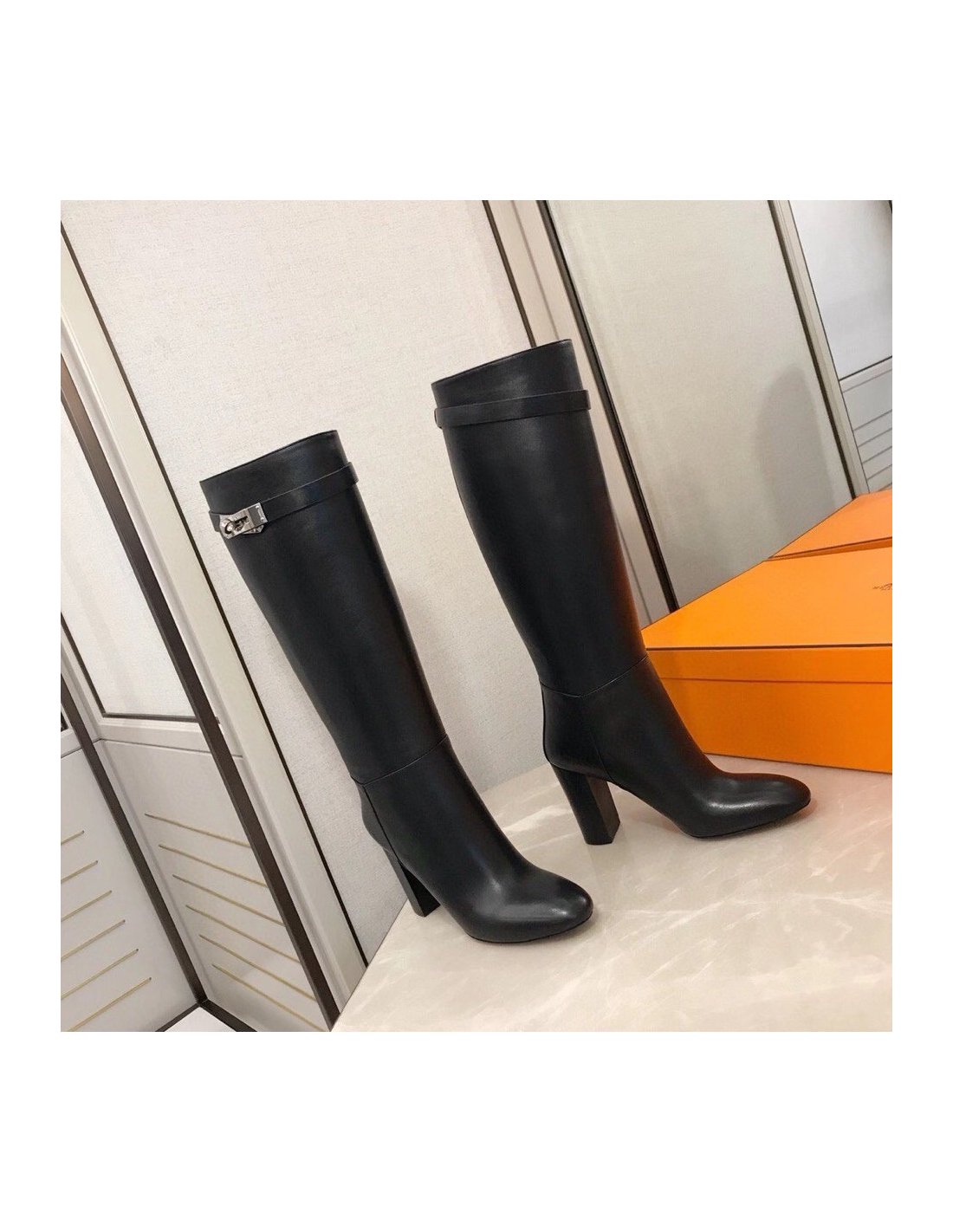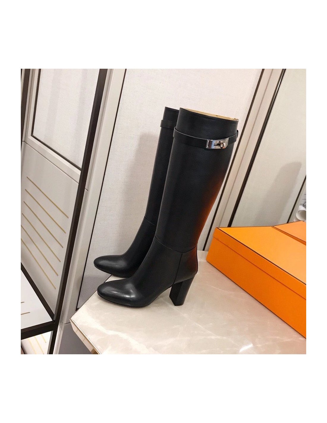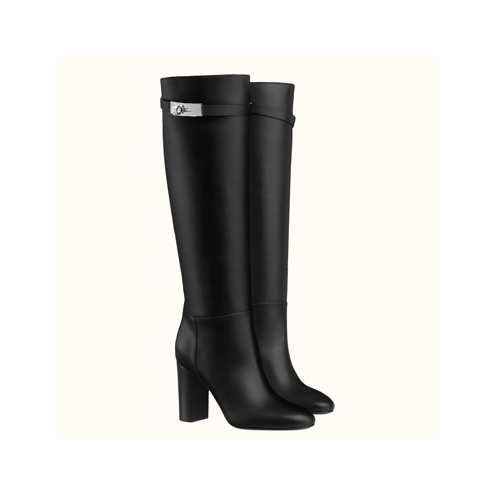 A minimalist, sleek design that adds a touch of elegance to any look. The Hermes's Story knee-high boots are updated with a high heel and iconic palladium plated buckle to the upper for added designer flair. Crafted from supple leather, the bold silhouette features a round toe and unique heel that will add a touch of glamour to your everyday wardrobe.