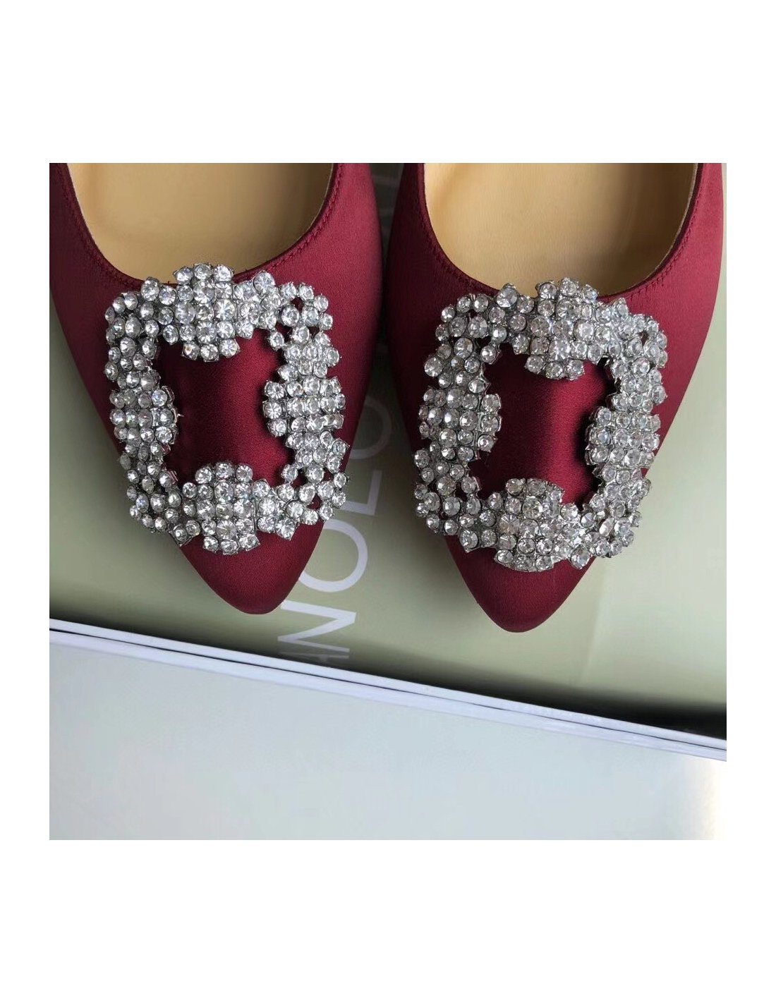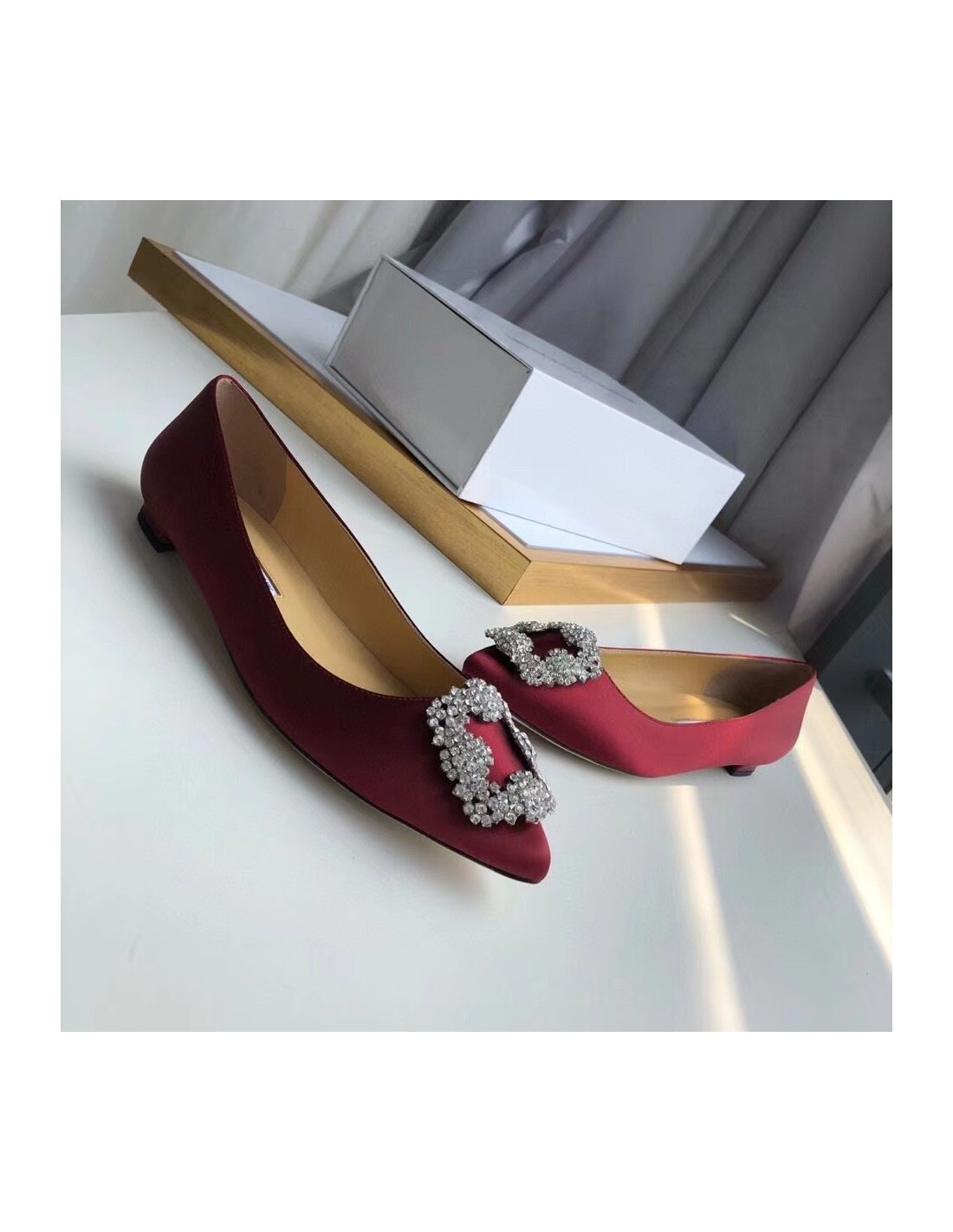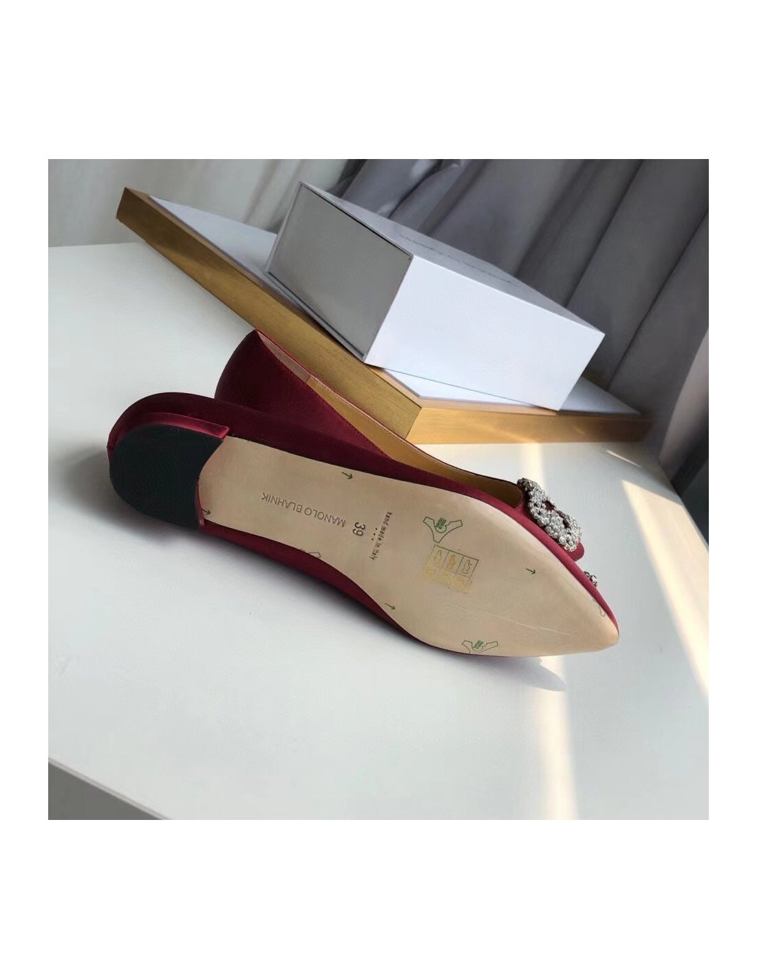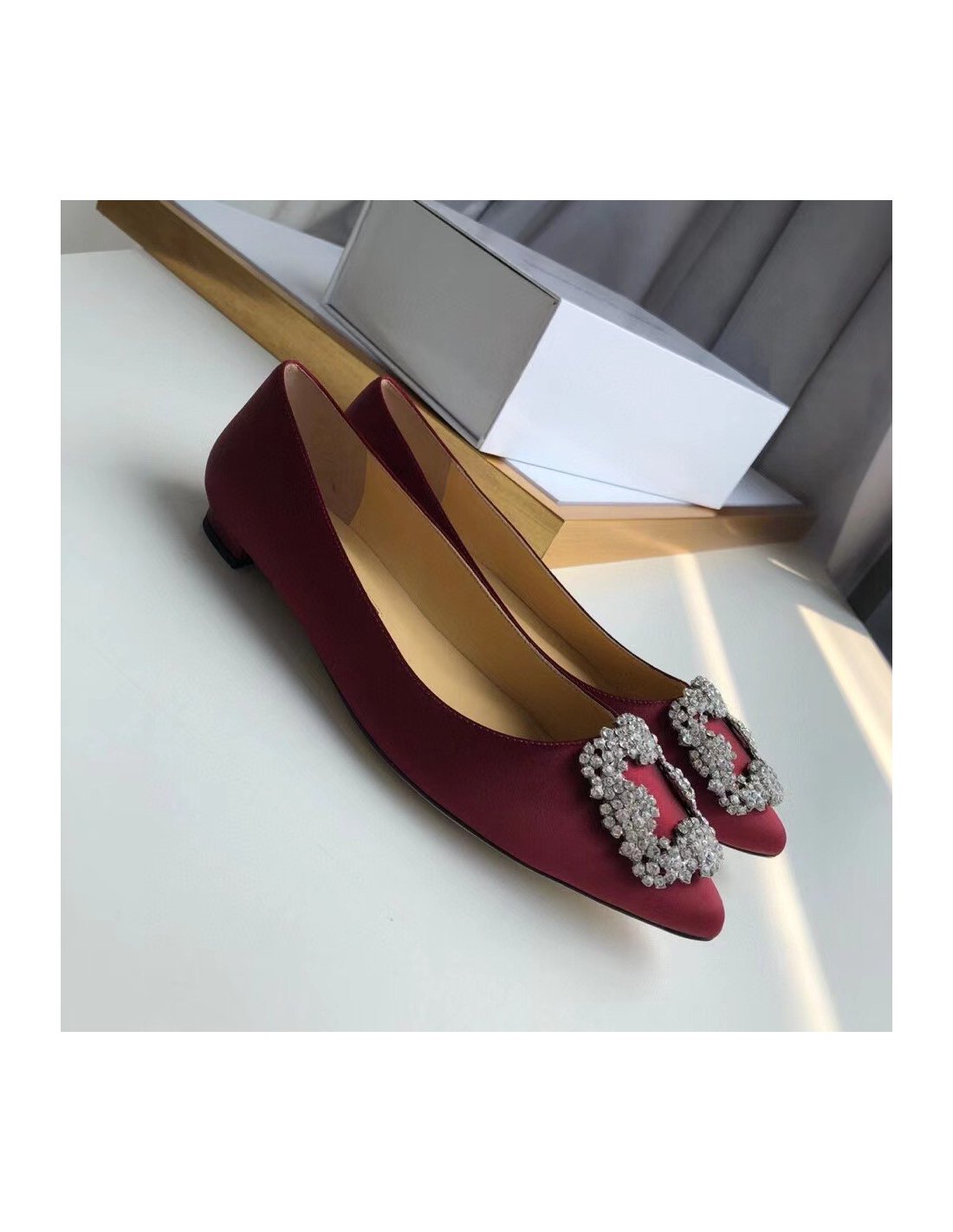 Manolo Blahnik Hangisi Flats In Bordeaux Satin with Crystal Buckle