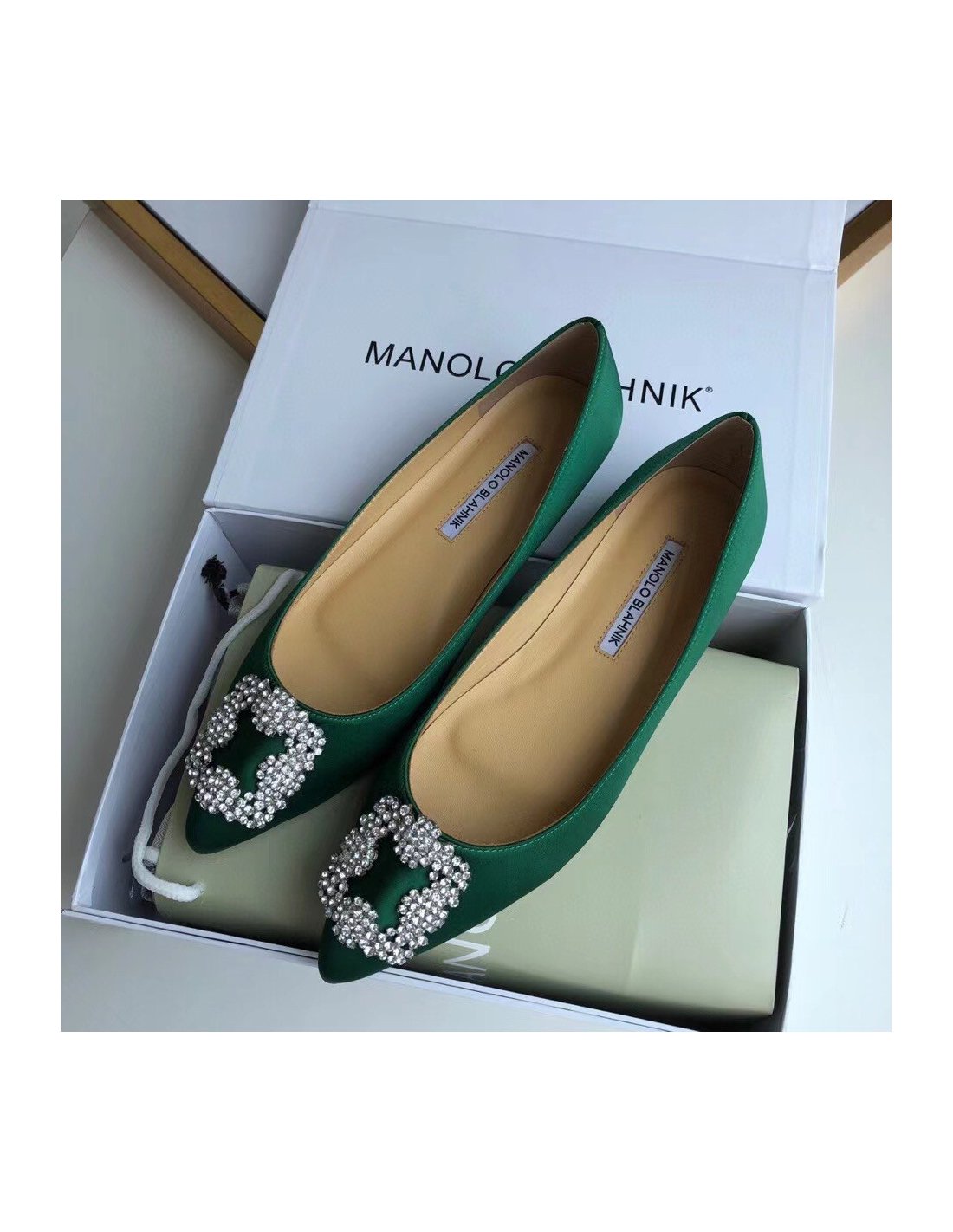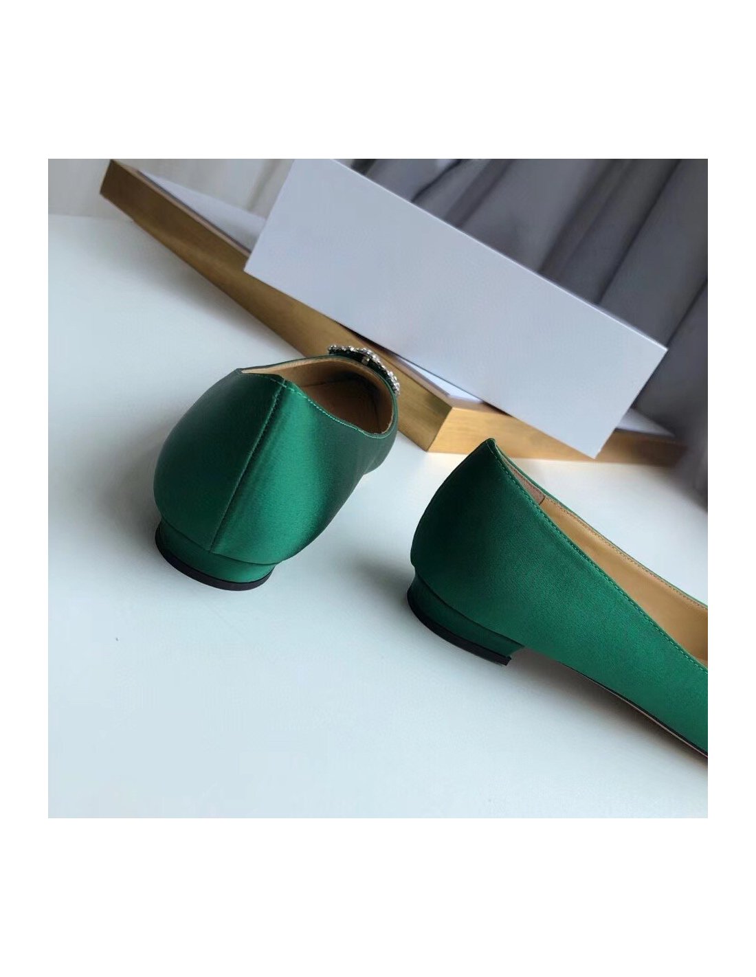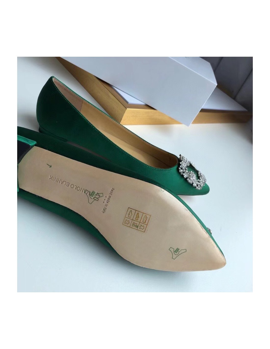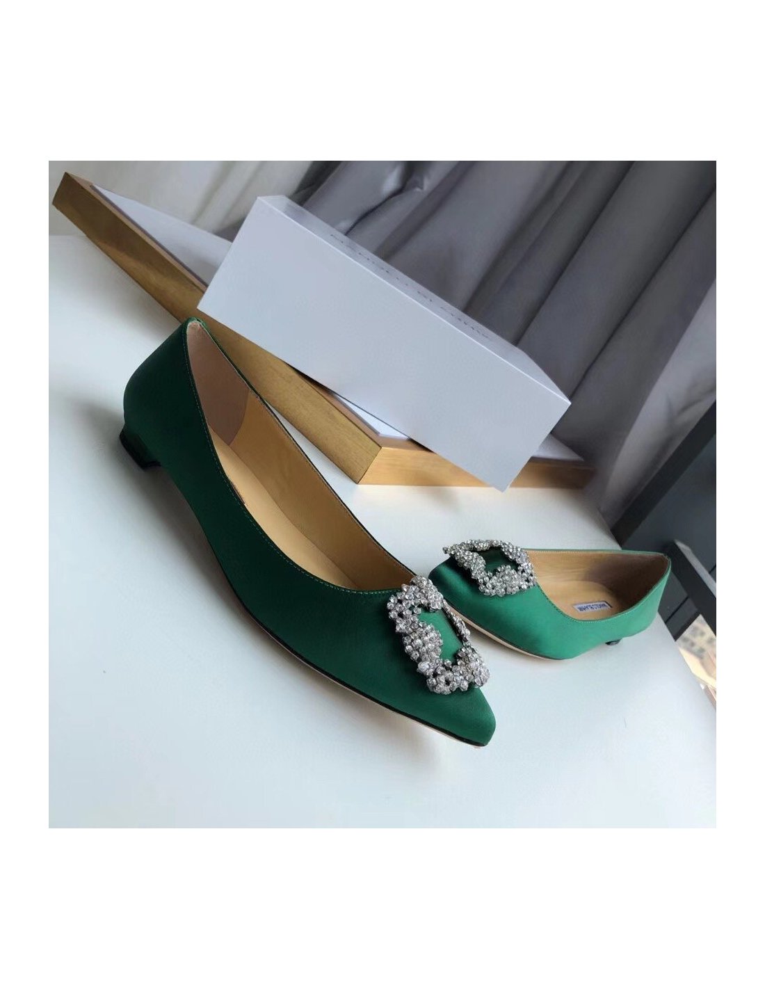 Manolo Blahnik Hangisi Flats In Green Satin with Crystal Buckle