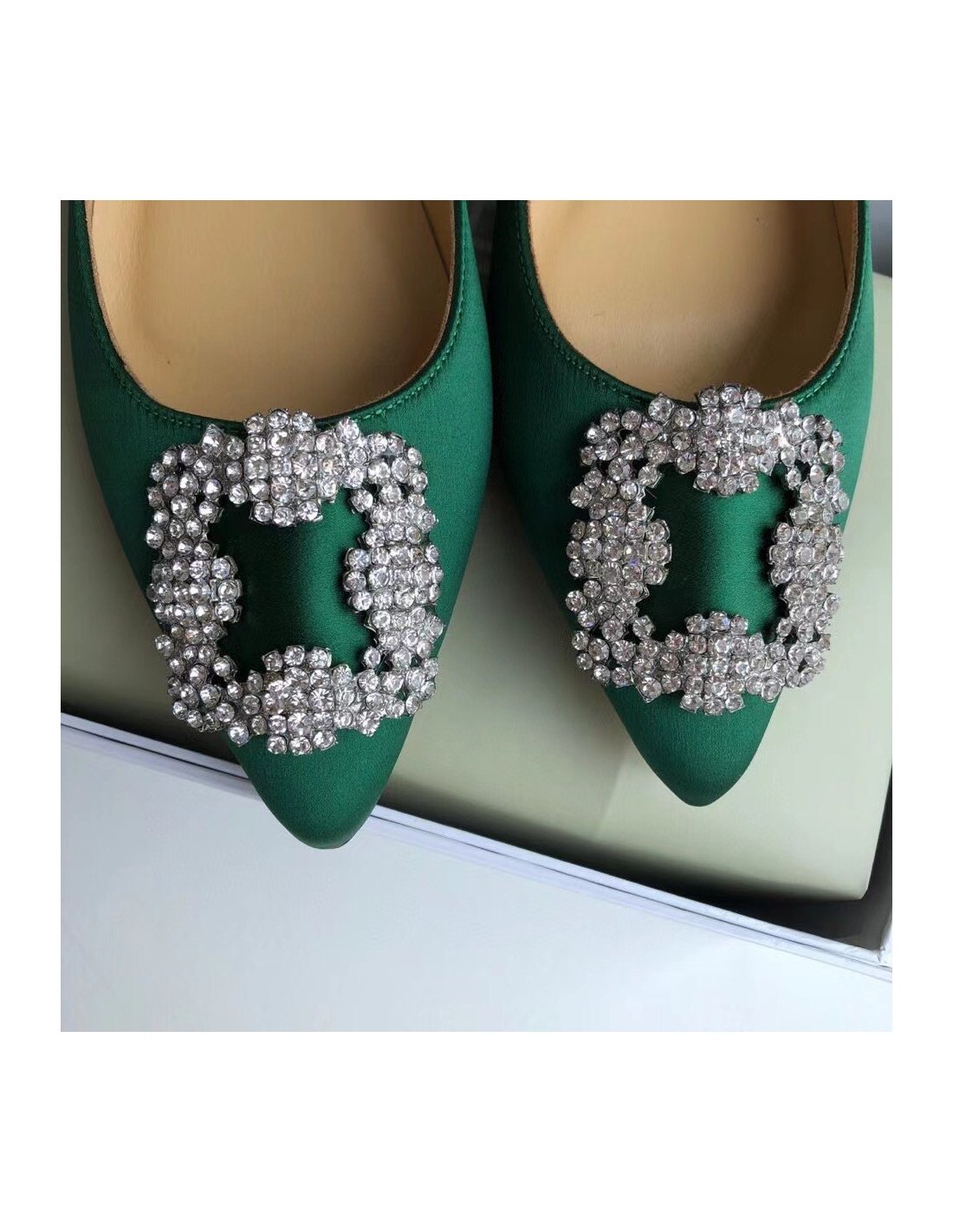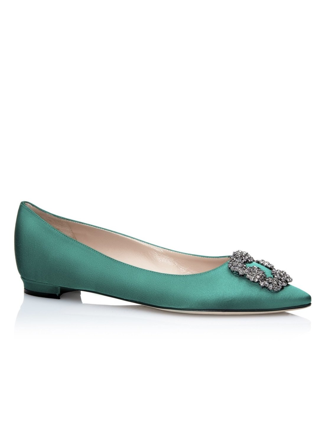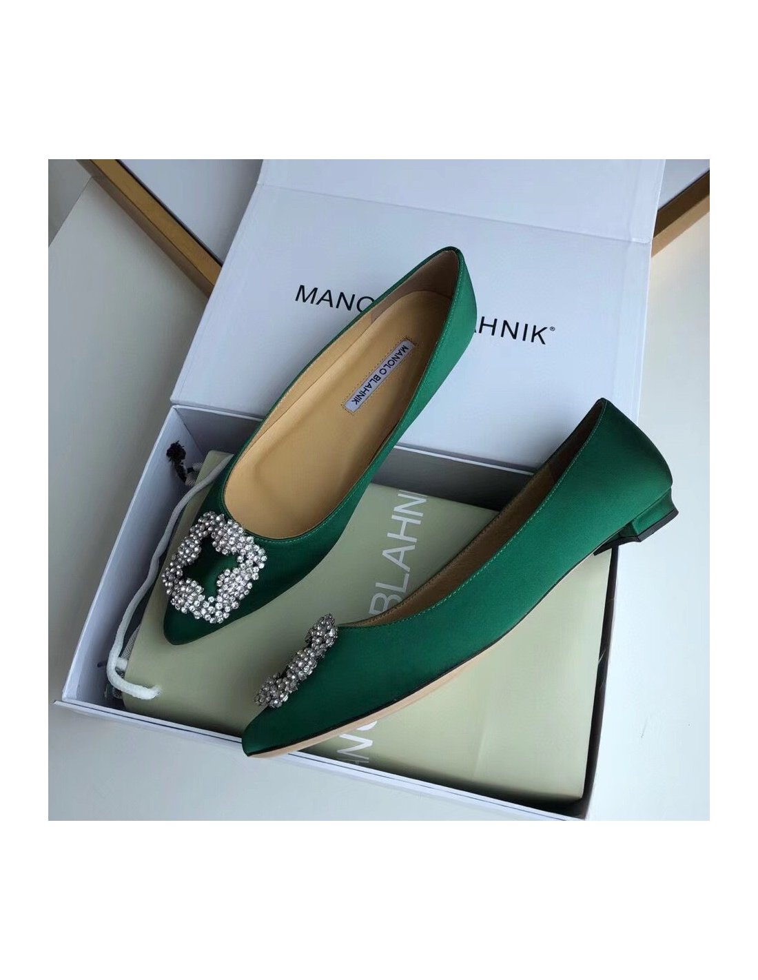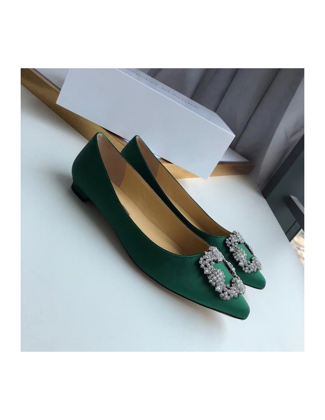 Manolo Blahnik Hangisi Flats In Green Satin with Crystal Buckle