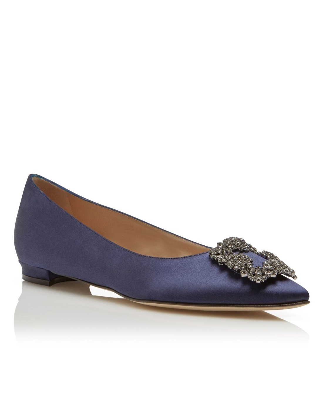 Manolo Blahnik Hangisi Flats In Navy Satin with Crystal Buckle