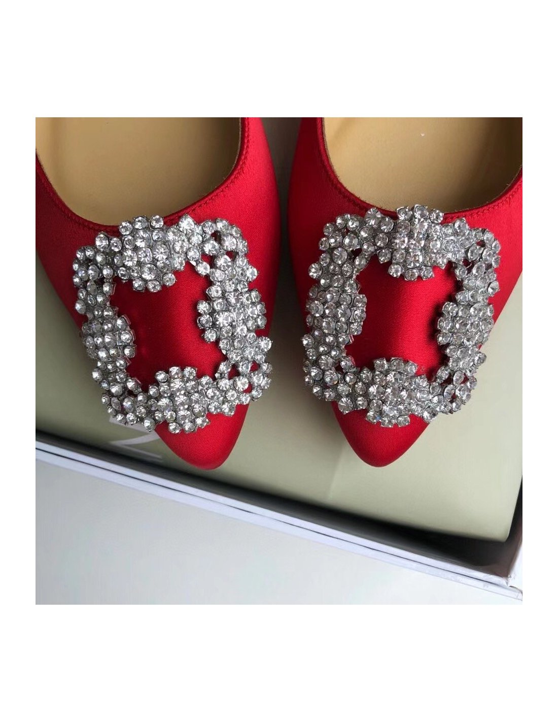 Manolo Blahnik Hangisi Flats In Red Satin with Crystal Buckle