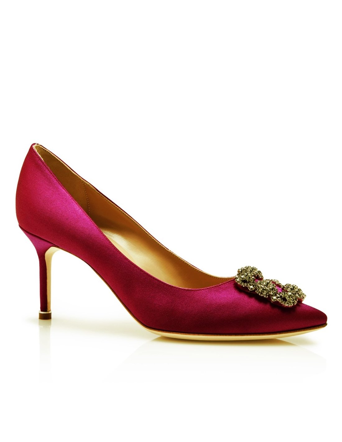 Inspired by mid-century courtesans and the paintings of Boldini, the Manolo Blahnik Hangisi pumps are universally recognised for their bejewelled brooch detailing. Crafted in beautiful silk satin with square crystal buckle, the ultra-feminine single-sole silhouette features a flattering low-cut, pointed toe and a signature metal-trimmed stiletto heel.
