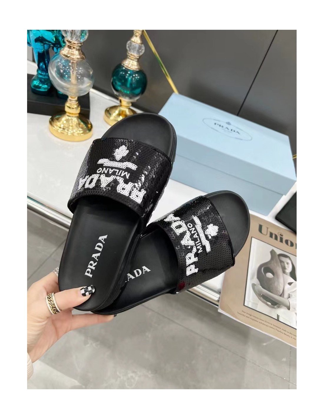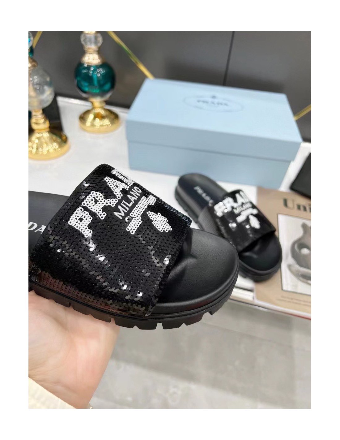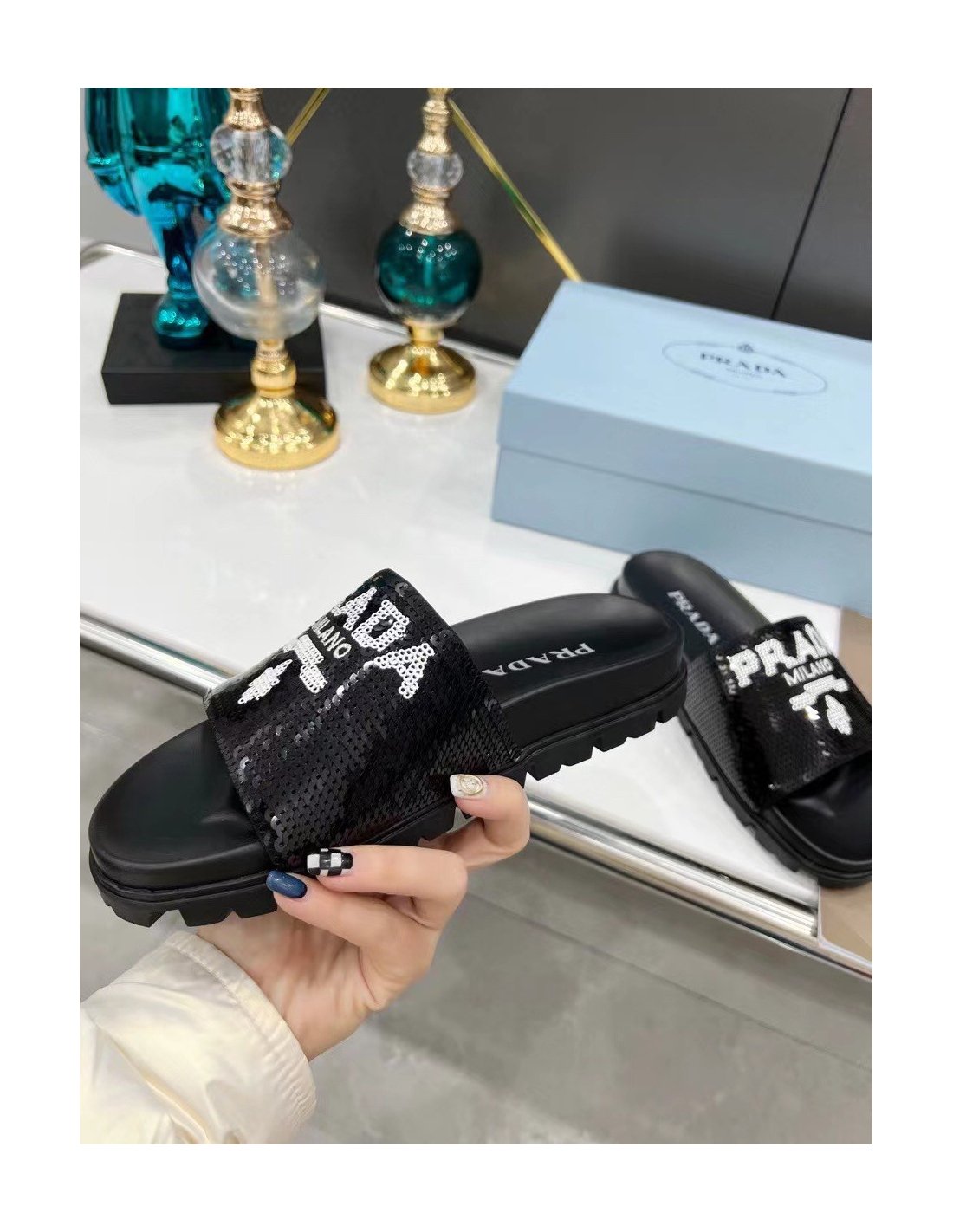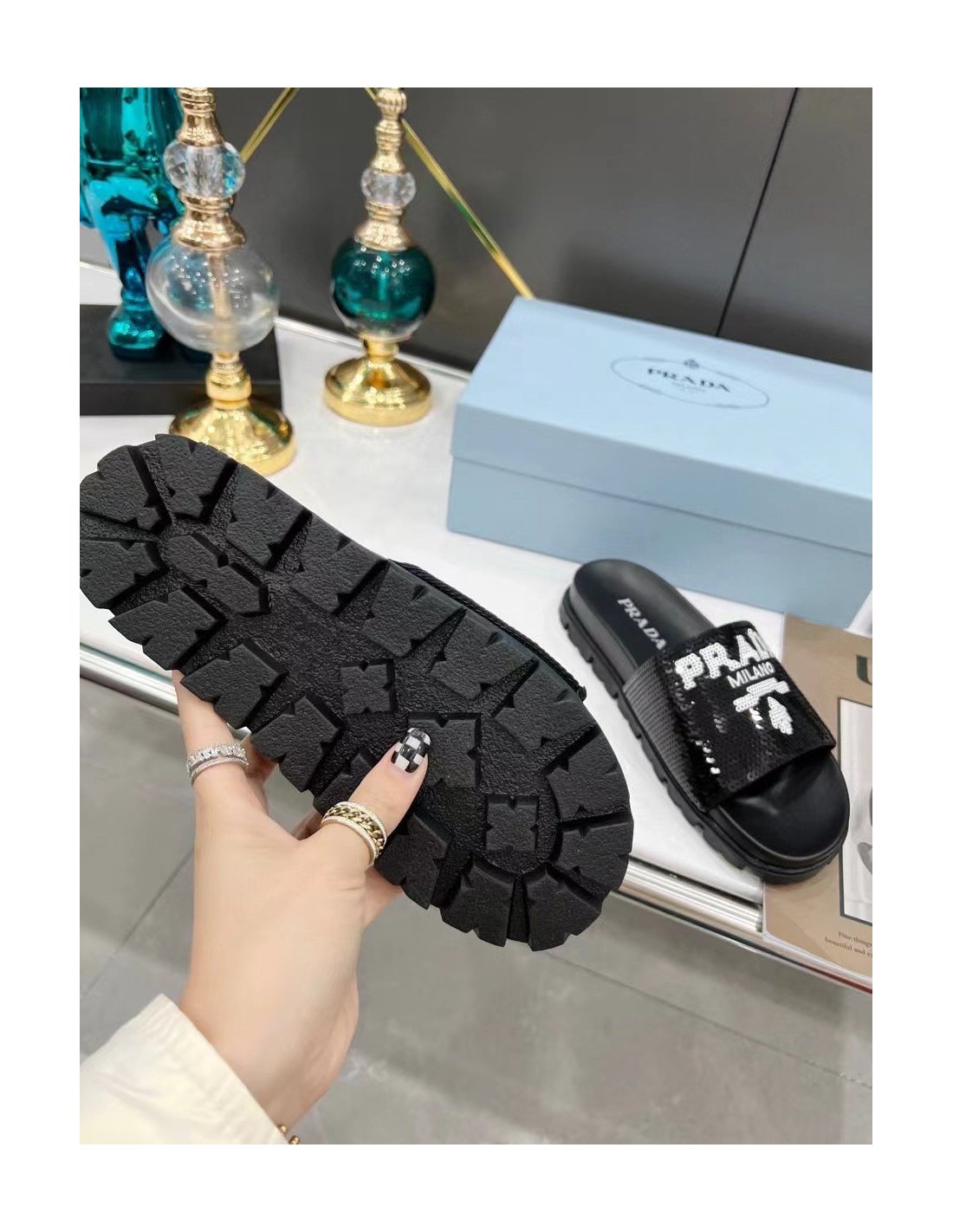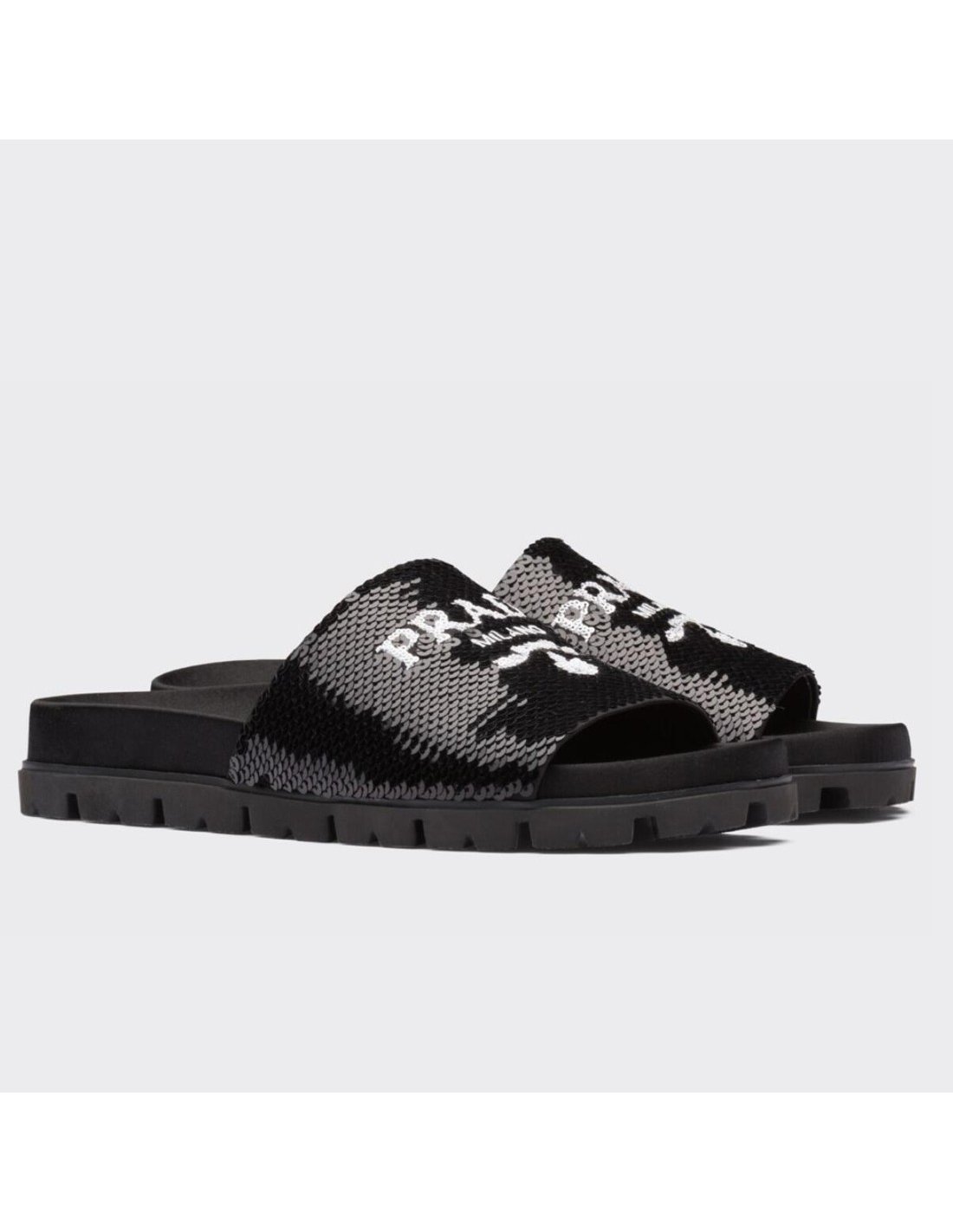 A streetwear-inspired design is reinterpreted in an unexpected way: these slides with rubber lug sole are covered all over with embroidered sequins. The hybrid concept pervades the Prada narrative and is translated into innovative designs with an interesting and unusual combination of materials, shapes, and functions.
