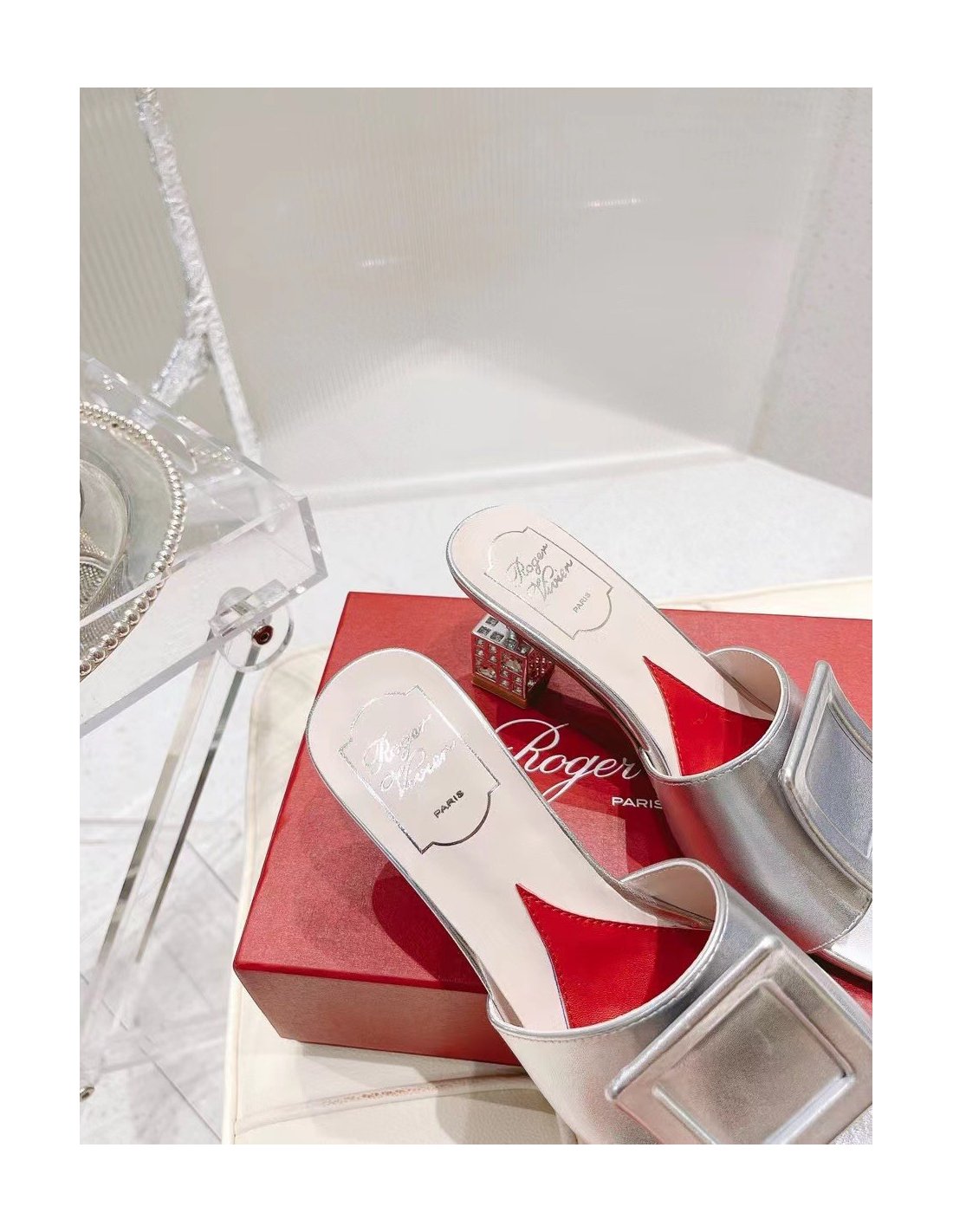 Roger Vivier Cube Strass Heel Mules in Silver Metallic Leather