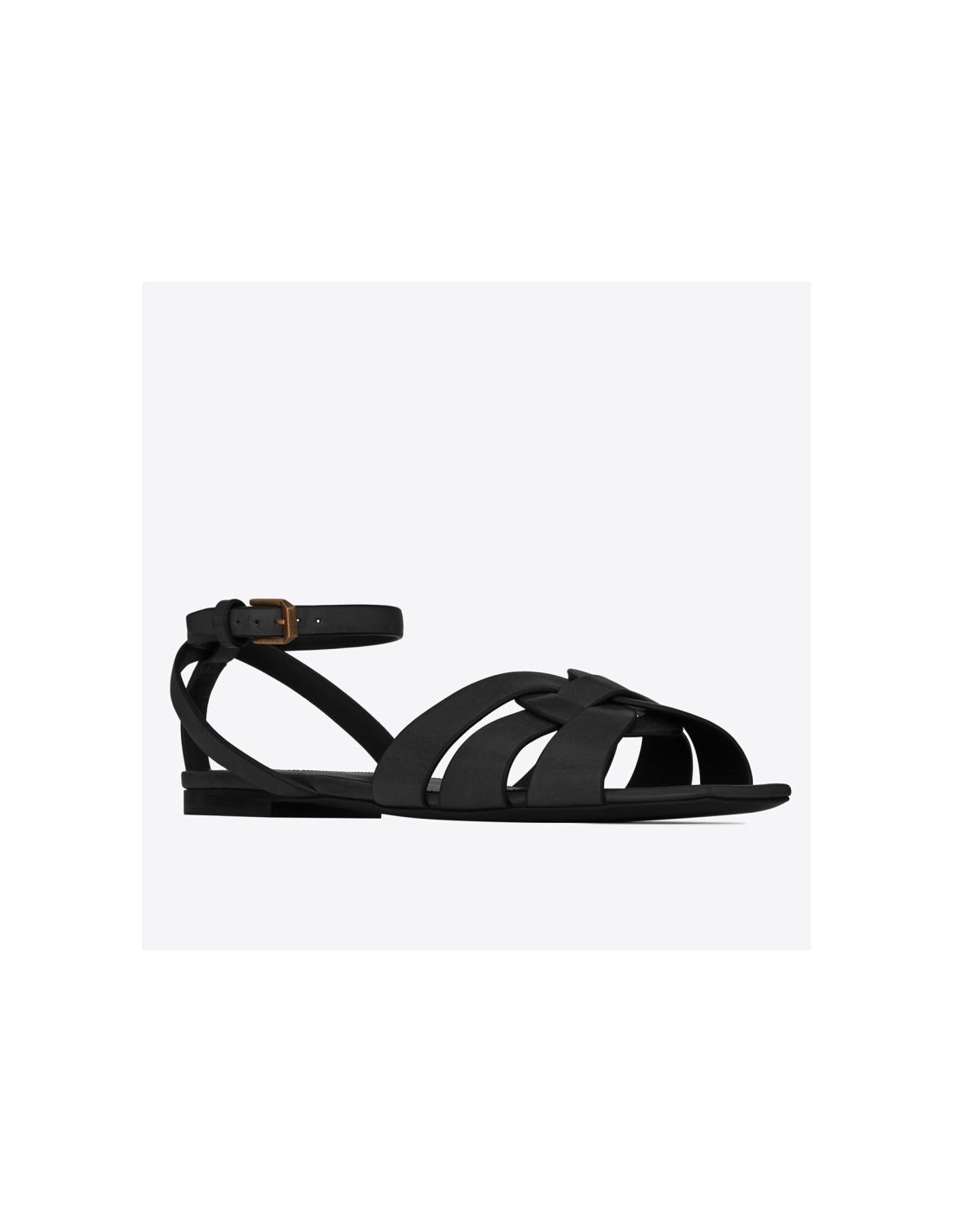 Tap Saint Laurents timeless approach to warm-weather dressing with the Tribute sandals, rendered here in a flat silhouette. Made from smooth leather, they have the style's signature interlocking straps at the square toe, then secure with wraparound straps at the ankle. Style with fluid separates during strolls along the seafront.