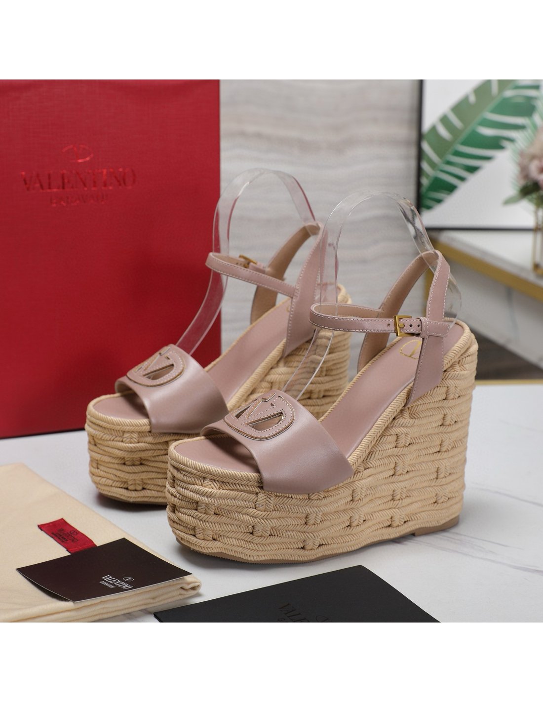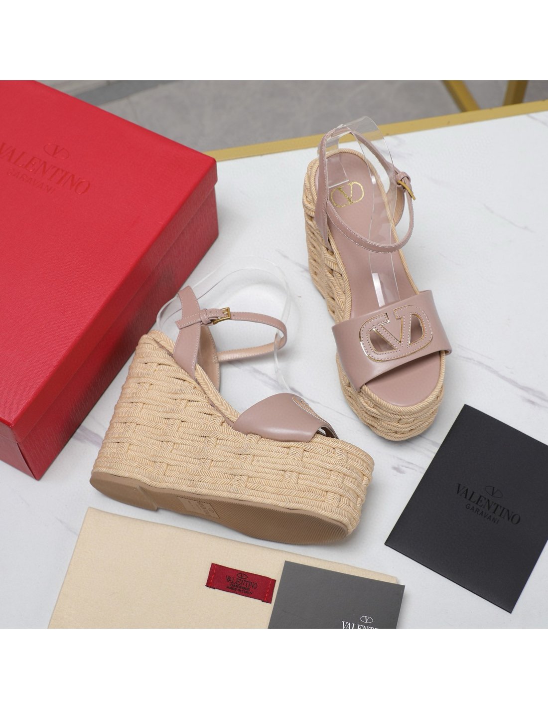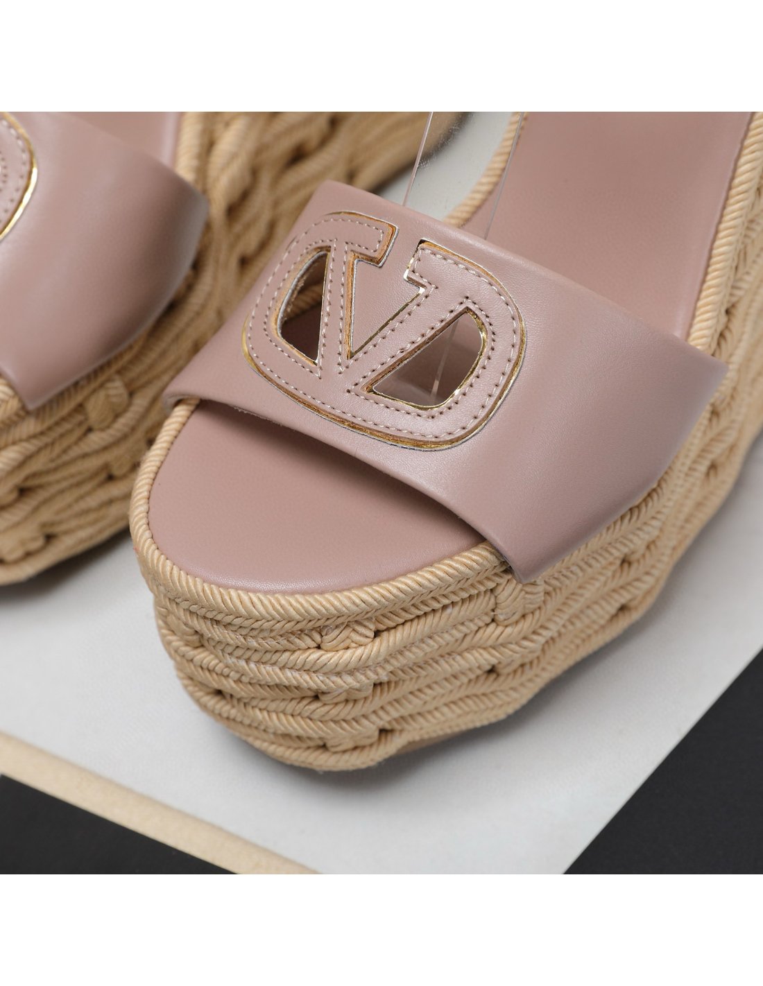 Cheap Reps Valentino VLogo Cut-out Espadrille Wedge Sandals in Beige Leather