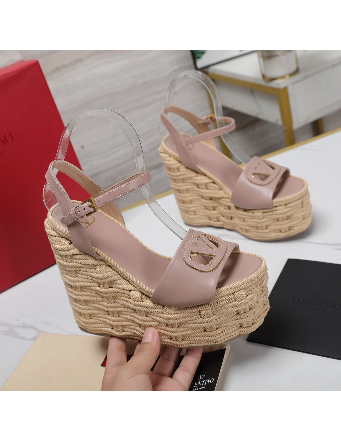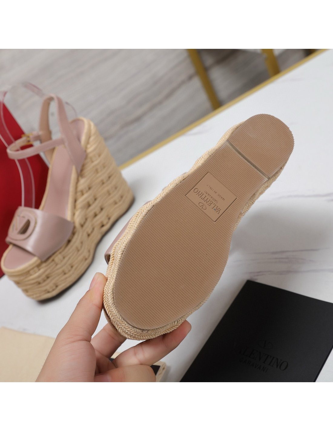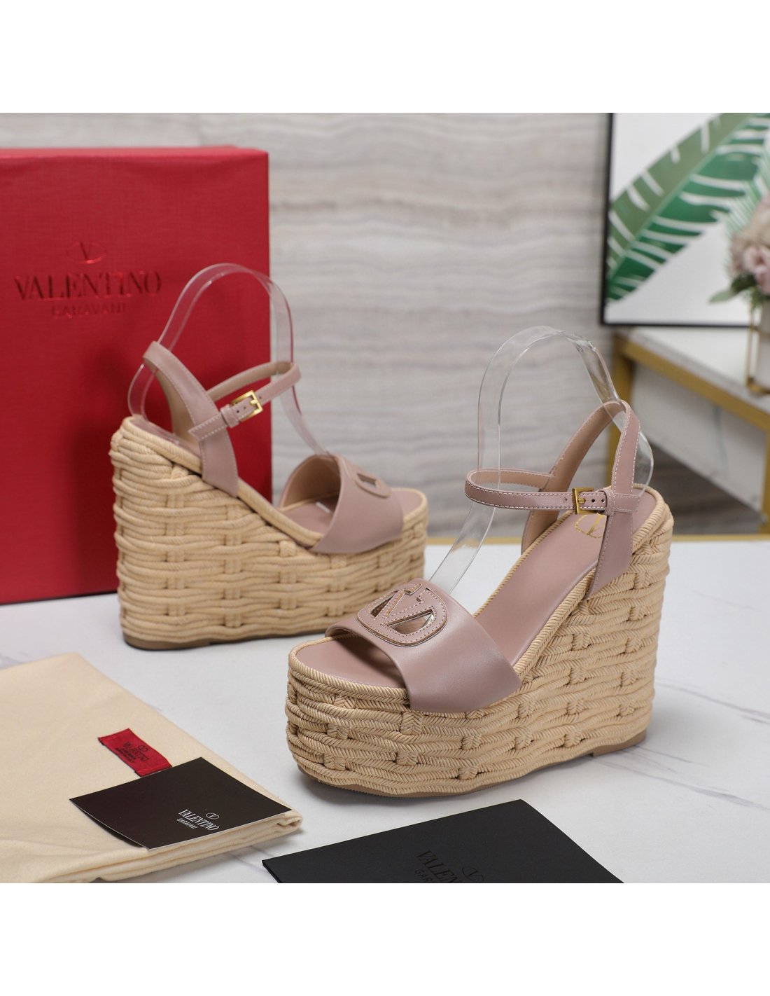 Cheap Reps Valentino VLogo Cut-out Espadrille Wedge Sandals in Beige Leather