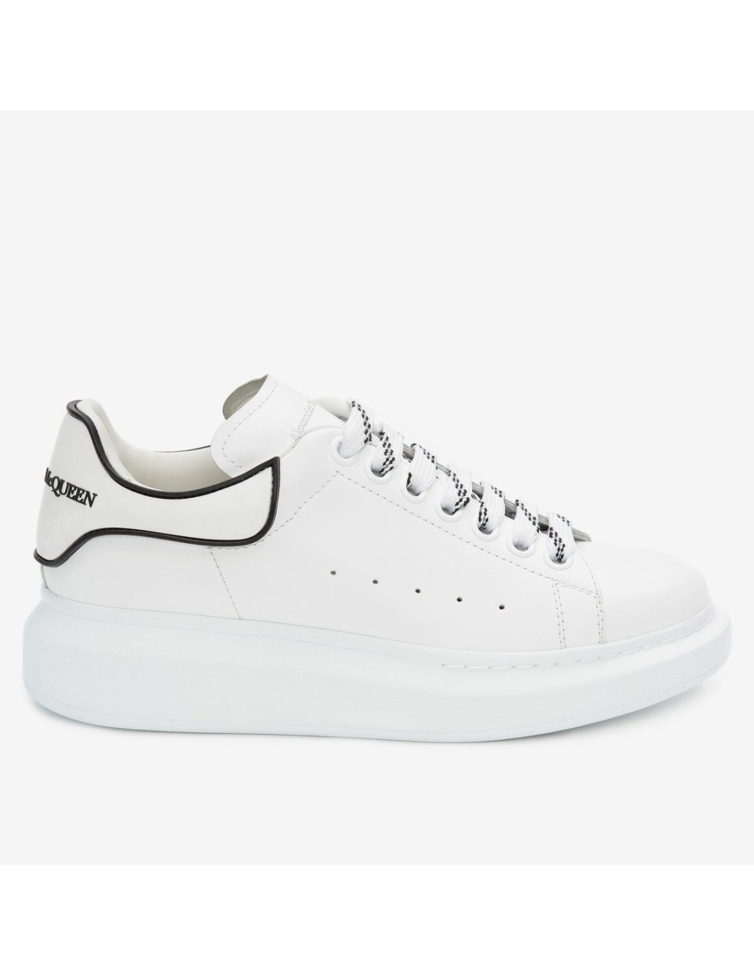 The Alexander McQueen Oversized Sneaker 'White Black' brings a clean colorway to its platform construction. Built with calfskin leather on the upper, the quarter panel sports perforations for breathability. The exaggerated, branded heel patch adds contrast in black, while underfoot, the platform sole unit completes the look.