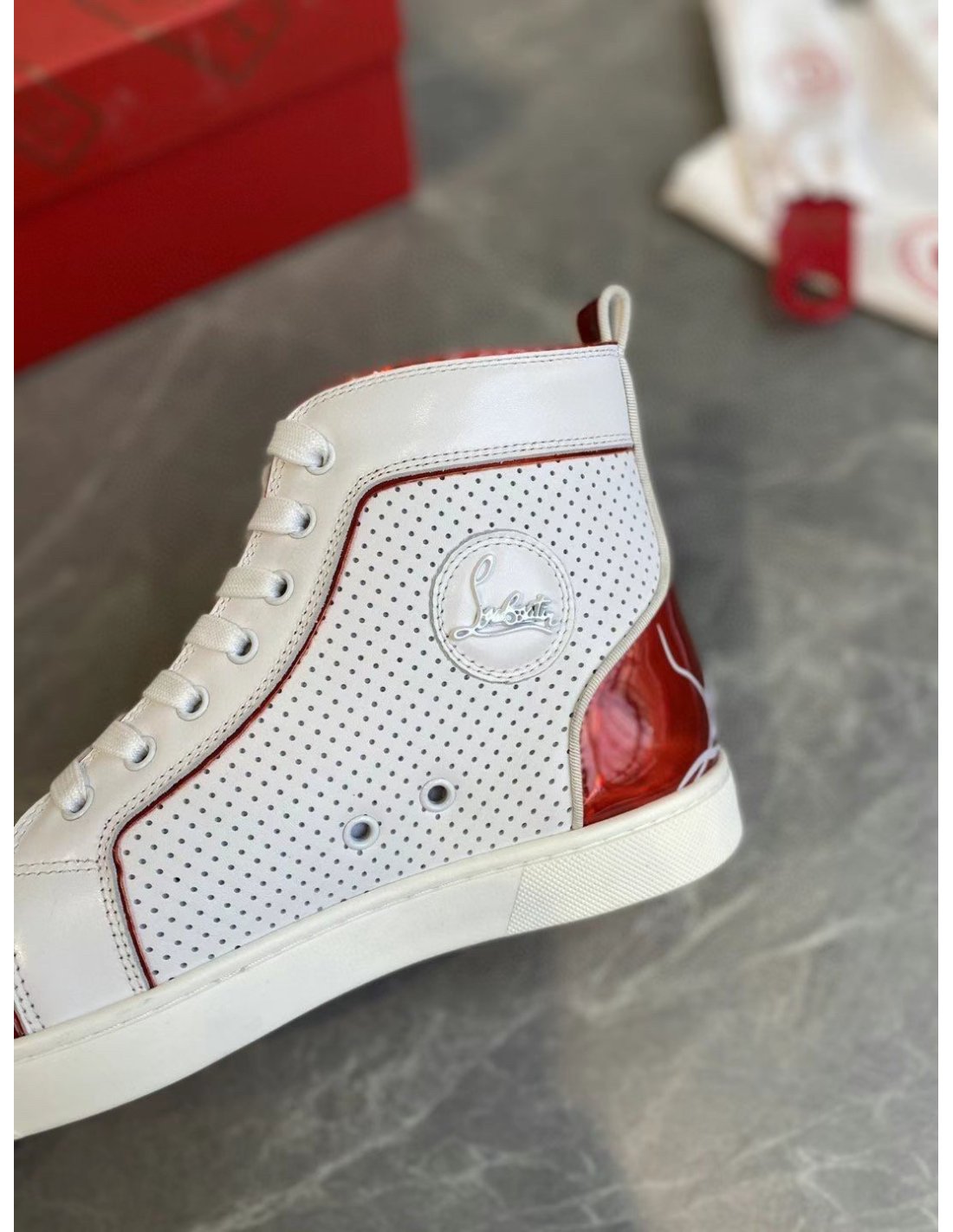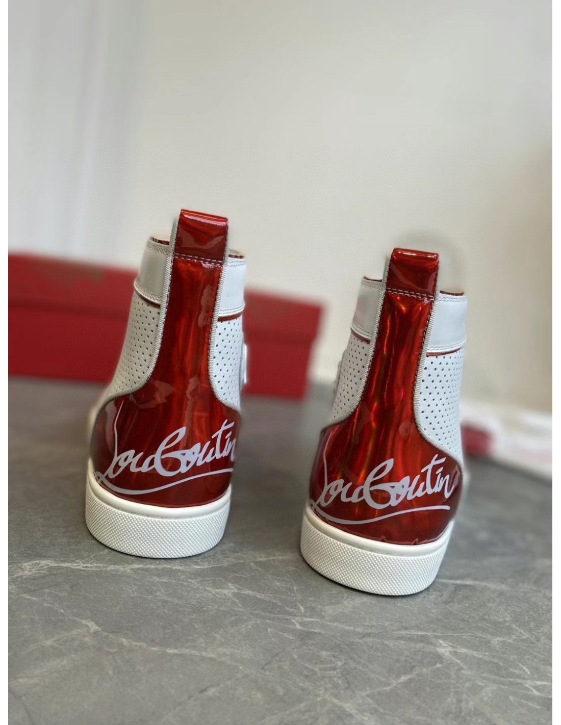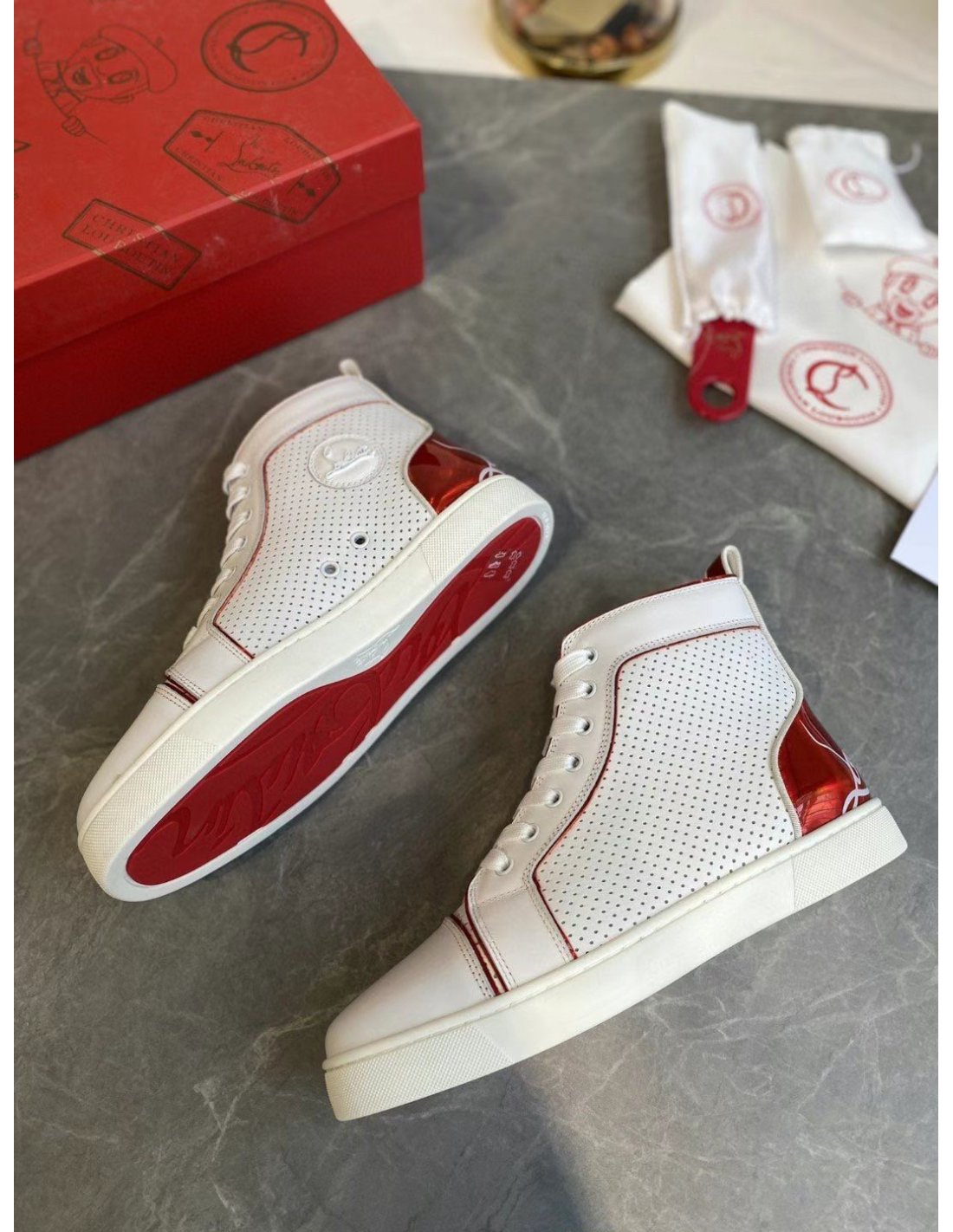 The Fun Louis Woman high-top sneaker is inspired by the world of basketball and mounted on a white rubber sole. The upper of this iconic model skilfully marries white perforated leather and Loubi red iridescent patent calfskin in a combination of elegant and sporty lines. Accented by delicate finishes, the counter is also adorned with the creator's signature and a badge bearing his name.
