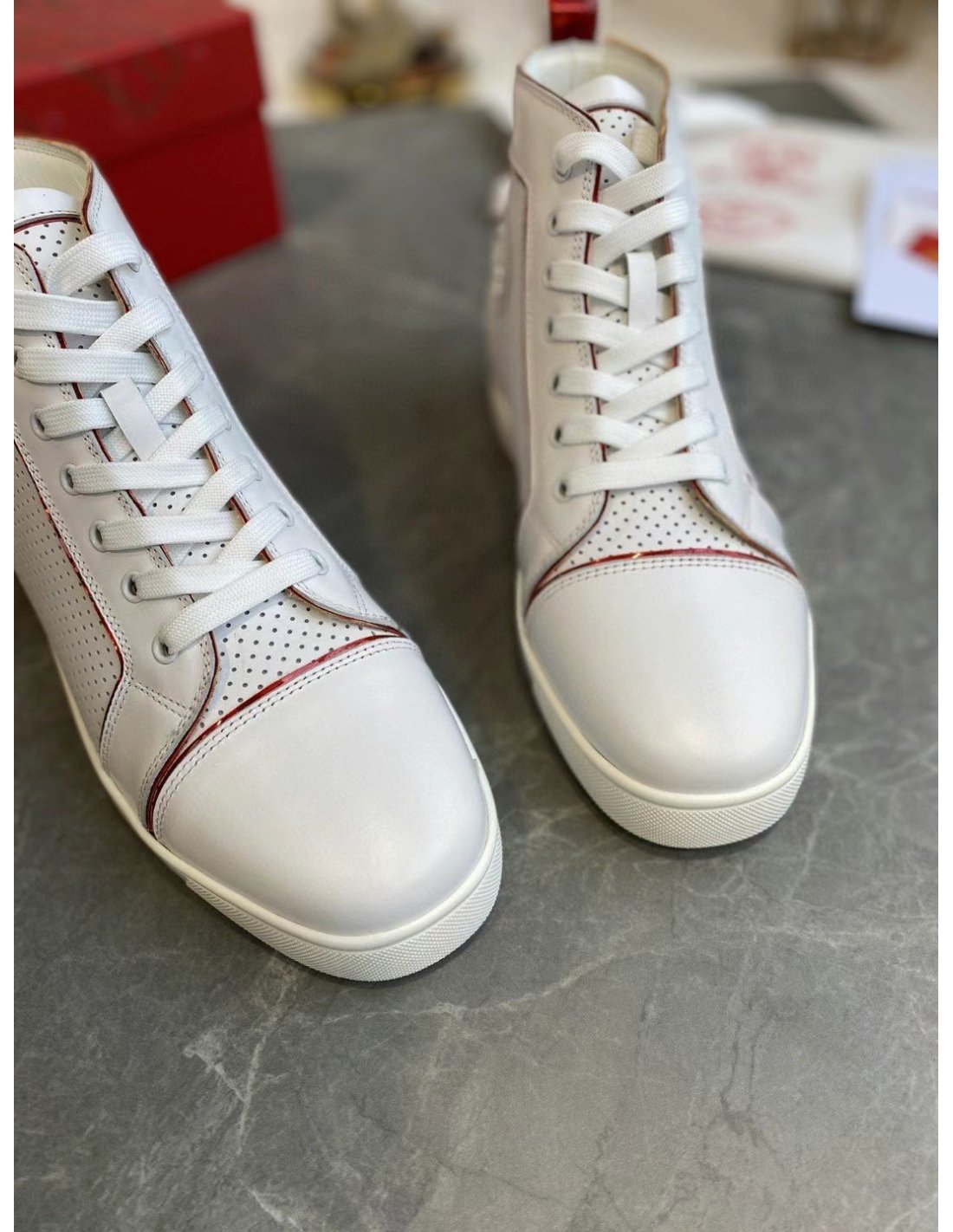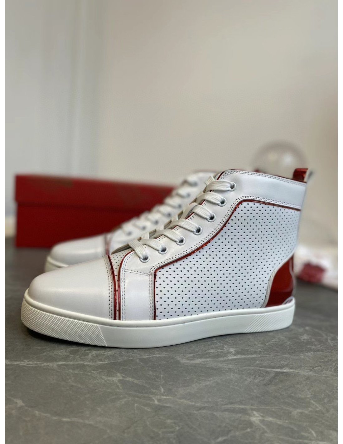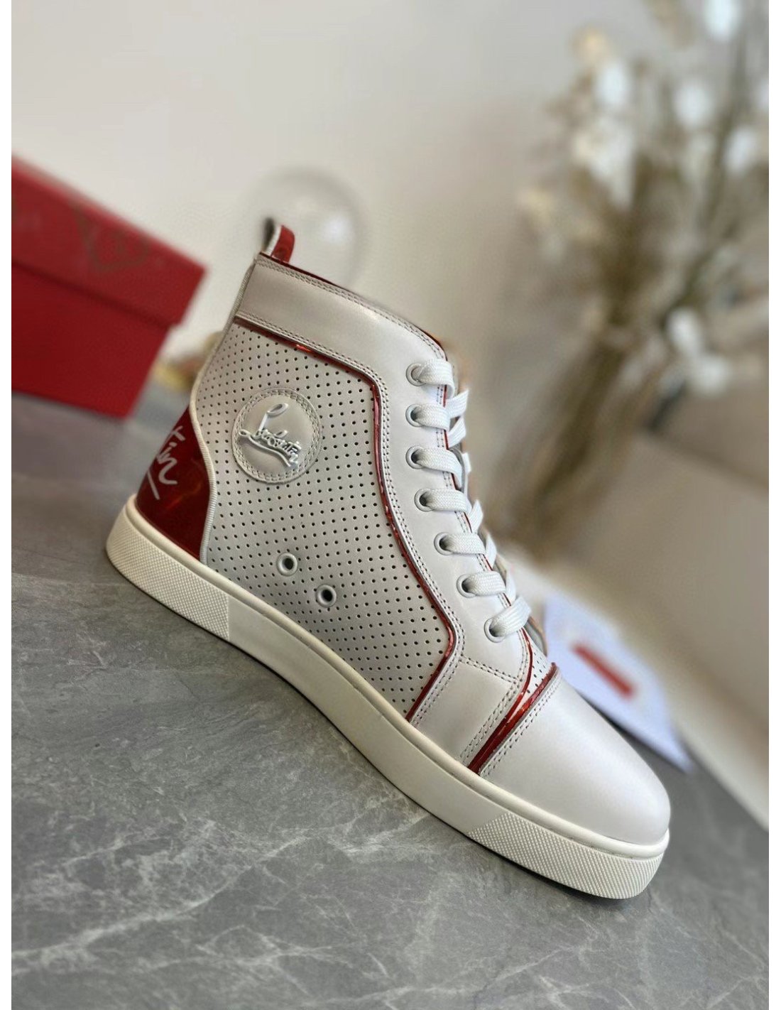 The Fun Louis Woman high-top sneaker is inspired by the world of basketball and mounted on a white rubber sole. The upper of this iconic model skilfully marries white perforated leather and Loubi red iridescent patent calfskin in a combination of elegant and sporty lines. Accented by delicate finishes, the counter is also adorned with the creator's signature and a badge bearing his name.